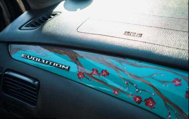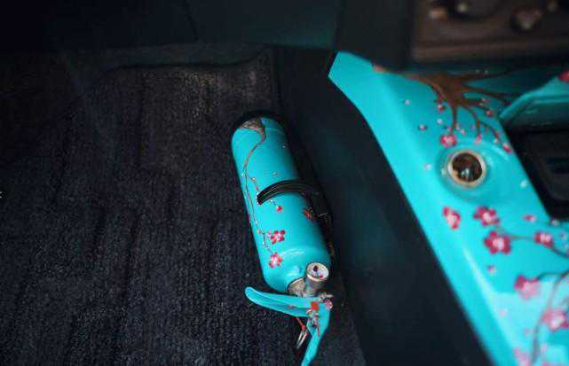 更绝的是内饰板的彩绘的樱花设计,所有这些都是手绘的。这种图案一直延伸到机舱,仪表板装饰,中控台甚至是灭火器,给人一种进入日本房间内实实在在看到樱花的真实触感,这种特别的风格,体现了车主个性的同时让人眼前一亮。