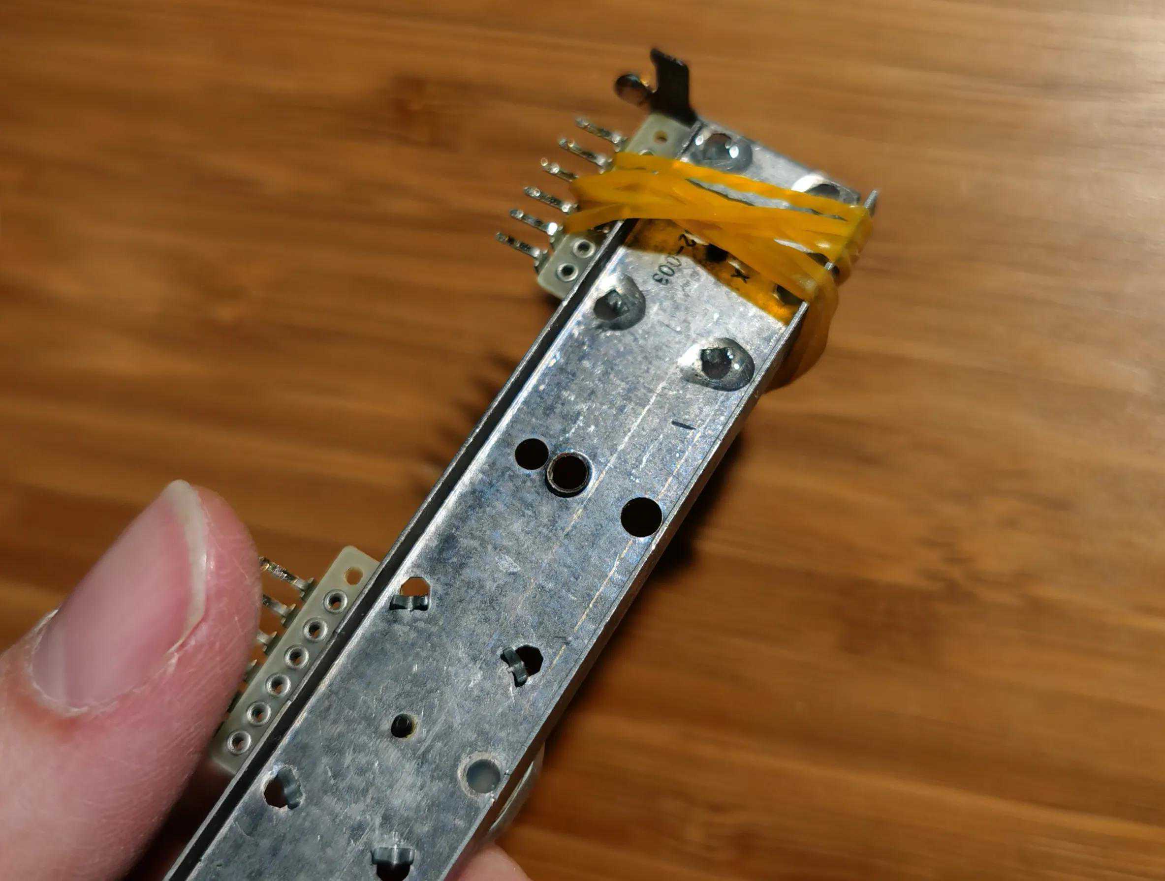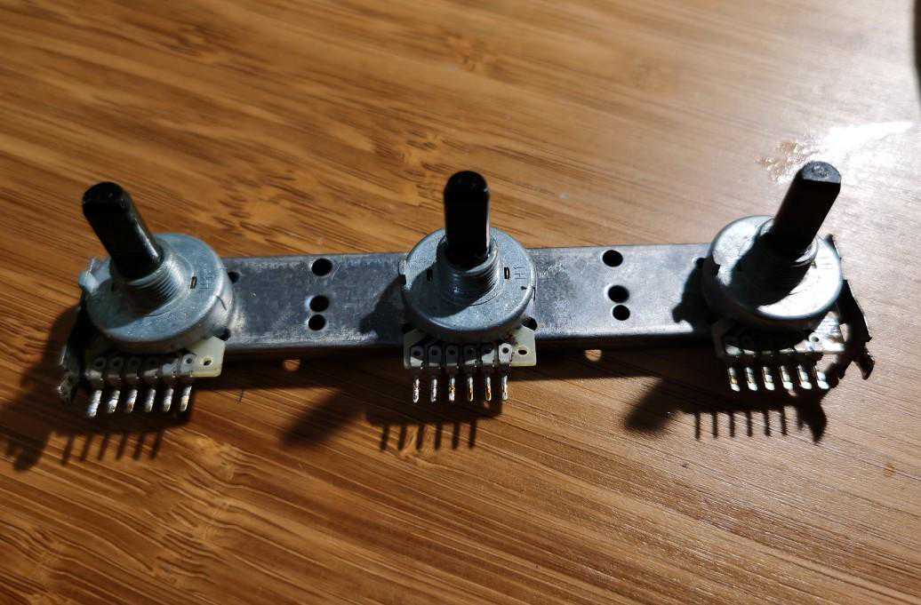 把机器拆开,发现平衡电位器和高低音电位器是三连体组合的,从网上某宝某鱼上面都没有找到有类似的配件,用万用表测量之后发现平衡电位器确实是有一个脚不通,没有其它办法了,只能先把平衡电位器拆解下来。
