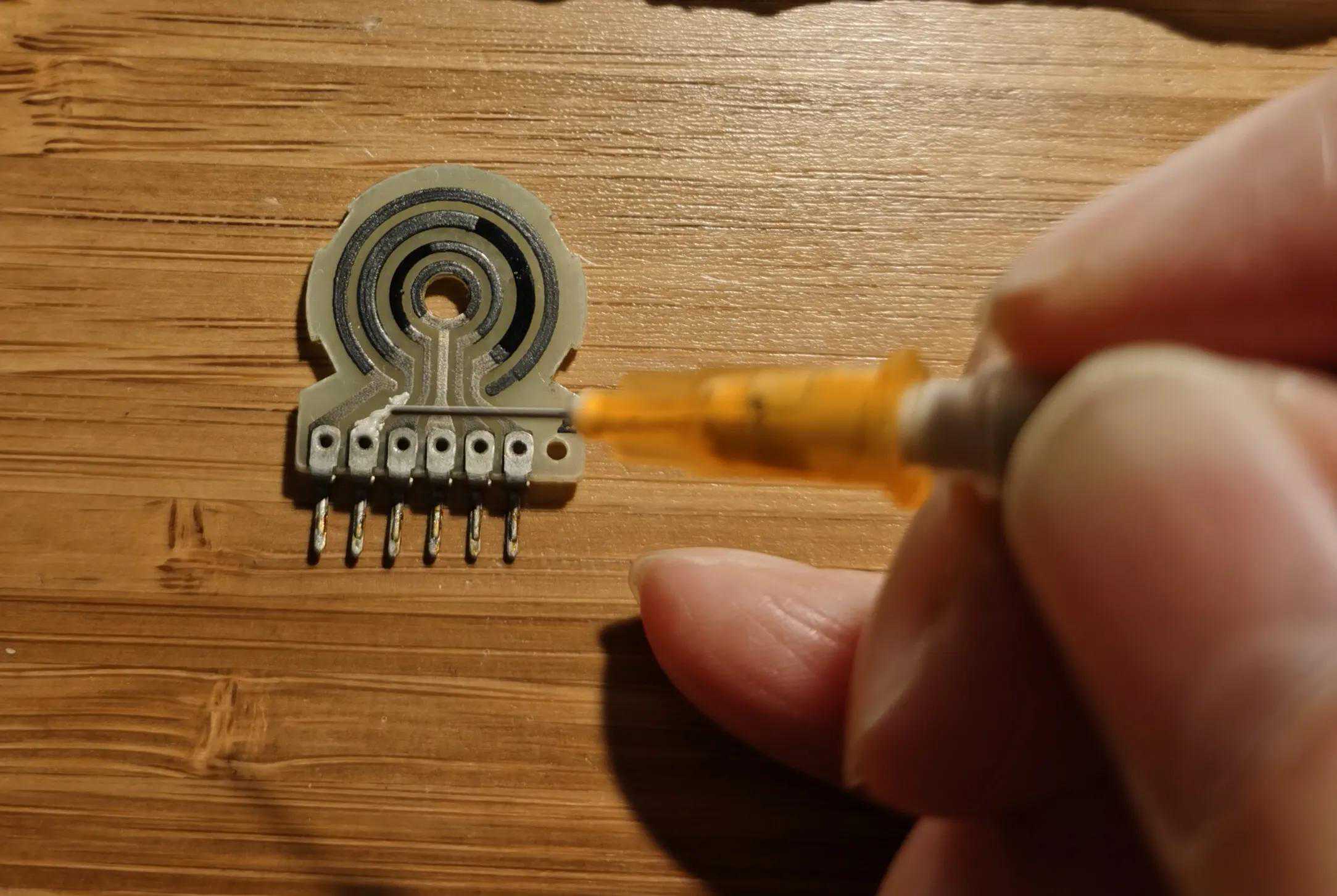 第二步:清洁润滑电位器触点将WD-40清洁剂喷出一点在小容器里,然后用牙签沾取清洁液,把三个电位的触点和碳膜全部都涂上一点点。