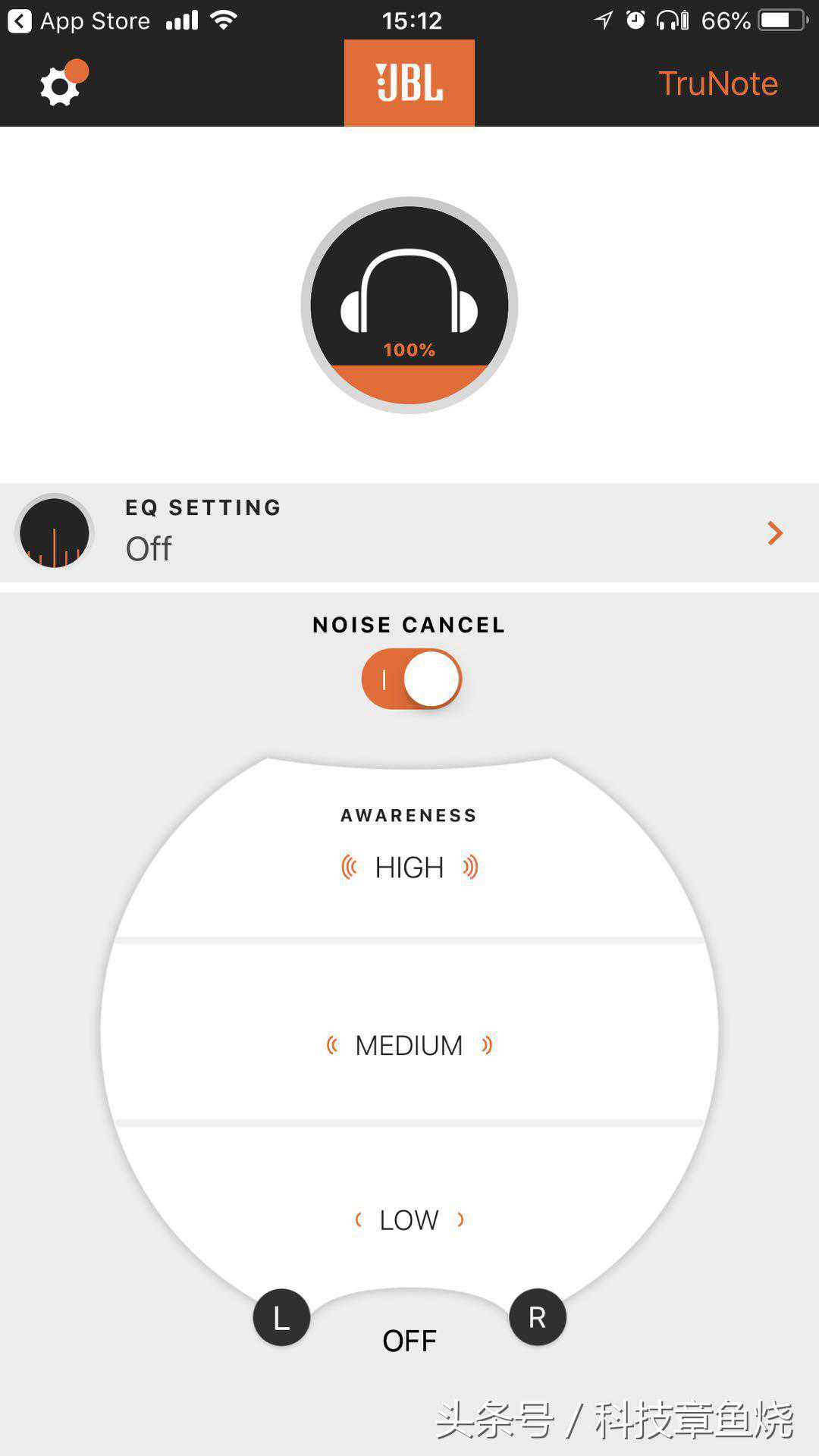 在和手机连接成功后,下载JBL的官方App"MyJBLHeadphone"就能开启更多耳机内藏的功能。例如Truenote在一打开App后就会自动提醒你运行。之后在主界面你能调节Awareness功能的强度,这是针对降噪耳机而设计的功能,可以避免因为降噪后失去了对环境声的注意力,例如在高级别下,一些高频的声响会更加明显。