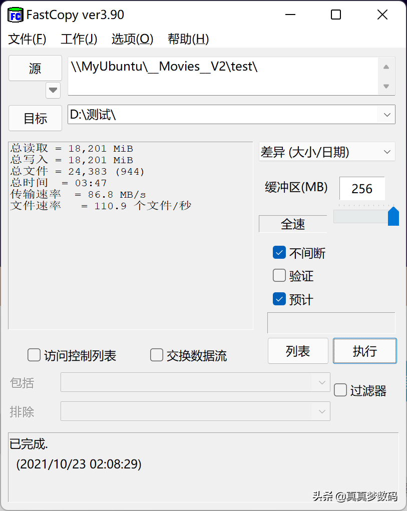 再开启SSD缓存做同样的测试,测得有SSD缓存时消耗时间为3分02秒,节省了45秒时间。同时在NAS的SSD缓存界面可以看到读取命中率曲线在传输小文件时有变化,证明缓存正在作用中,但传输大文件时读取命中率就极低了,看来这个SSD缓存对读写零碎文件时有很大的帮助。顺便说下QNAP的SSD缓存策略特别灵活,你可以随时给某个存储空间加上缓存或者取消缓存,不需要等待;群晖的SSD缓存在创建和取消时都要花费很长的时间。