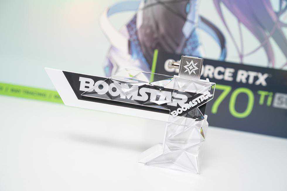 星曜定制版显卡支架支持调节高度和RGB灯光同步,外部采取和显卡本体统一水晶透明的外壳,上面附有BOOMSTAR的LOGO标识。