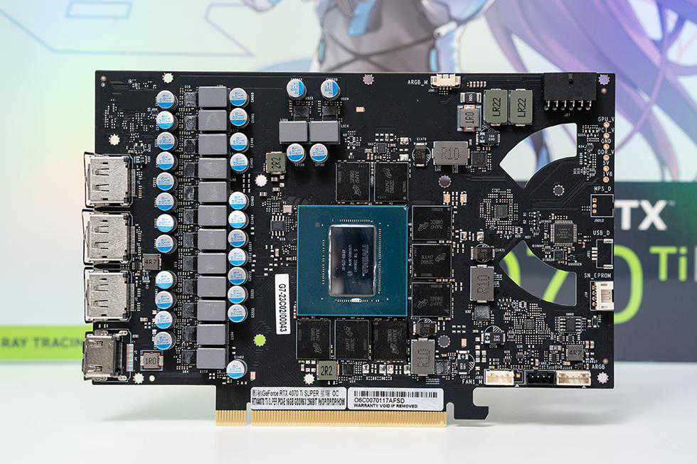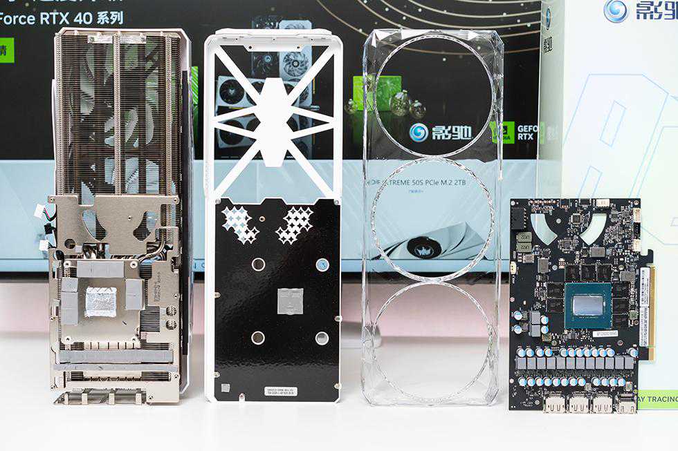 将影驰GEFORCERTX4070TiSUPER星曜OC显卡的散热器和背板拆开后,可以看到采用非公版设计,黑色的8层高规格PCB紧凑设计严谨合理。