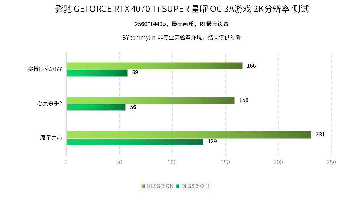 游戏性能测试:相较DLSS2,DLSS3在其基础上可以利用AI和GeForceRTX40系列GPU上的第四代TensorCore和光流加速器,生成更多的高质量帧,从而大幅提升帧数,能够在保持画质和反应速度的同时大幅度提升性能。为了能更直观的体现DLSS3的效能,选取《赛博朋克2077》、《原子之心》和《心灵杀手2》三款游戏在2K和4K分辨率进行对比。画质设置最高,光追效果设置最高。可以看到开启DLSS3后,游戏整体帧数均破百,比DLSSoff状态下提升2-3倍,可轻松高帧畅玩4K光追游戏。