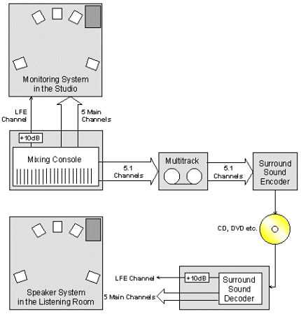 LFE声道在录音时比其他声道低10dB,而在播放时,还音系统自动加了10dB的增益。所以LFE声道的信噪比比主声道低10dB,但是,动态范围却大10dB。由于LFE声道的频带较窄,所以牺牲信噪比换取动态范围还是比较科学的做法。请参考下图。