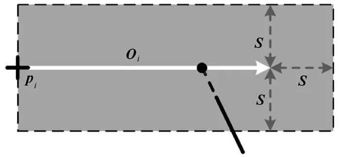 1)如果特征点具有3个及以上几何结构方向,对其中任意两个满足夹角α∈[θ,π-θ]的几何结构方向,分别在对应的几何结构方向上寻找显著点。其中,在每个方向上寻找显著点的方法如图4所示[23]。图4中,pi为特征点,Oi表示pi的一个几何结构方向,为Oi确定一个长度为|Oi|+S,宽度为2S的向量支撑区域(其中,|Oi|表示向量Oi的模,参数S用于控制向量支撑区域的尺寸)。如果向量支撑区域内存在直线特征且与该几何结构方向的交点也位于向量支撑区域内,则认为该交点是该几何结构方向上的一个显著点。由两个方向上的显著点与特征点构成平行四边形区域,即为特征点支撑区域(图5(a))。如果在一个几何结构方向上存在多个显著点,则每个显著点分别用于构建特征点支撑区域,得到多个支撑区域。