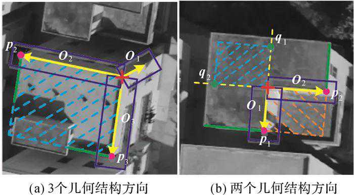 图5所示为构建特征点支撑区域示意图。图5(a)所示为特征点具有3个几何结构方向的情况,由于O1的向量支撑区域内没有直线特征,即该方向上没有显著点,因此无法与其他几何结构方向一起构建特征点支撑区域。O2和O3的向量支撑区域内分别存在直线特征且交点也位于向量支撑区域内,因此可以在O2和O3所夹范围内确定一个特征点支撑区域(蓝色虚线标记区域)。图5(b)所示为特征点具有两个几何结构方向的情况,获得显著点p1和p2以后,分别在几何结构方向的反方向确定对称点q1和q2作为虚拟显著点,形成两个特征点支撑区域(橙色和蓝色虚线标记区域)。分别由显著点和虚拟显著点确定特征点支撑区域可以保证当特征点位于视差不连续区域时至少有一个支撑区域具备视角不变性。在图5(b)所示情况中,显著点确定的支撑区域(橙色虚线标记区域)的影像内容不具备视角不变性,而虚拟显著点确定的支撑区域(蓝色虚线标记区域)的影像内容具备视角不变性。