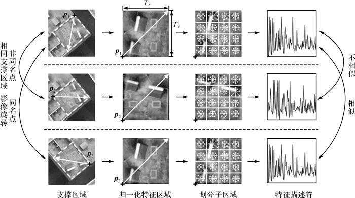 通过本文提出的特征区域归一化处理,一方面可以避免建筑物同一顶(侧)面上不同位置的角点因为对应于同一个支撑区域而产生错误匹配,另一方面能够消除影像旋转变化的影响。如图6所示,特征点p1和p2虽然支撑区域相同,但是经过本文方法得到的特征区域和特征描述符具有较强的可区分性,能够避免错误匹配。虽然特征点p1和p3所在的影像存在旋转变化,但是本文提出的特征区域归一化方法能够消除影像旋转变化,得到相似的特征区域和特征描述符,提高特征匹配率。