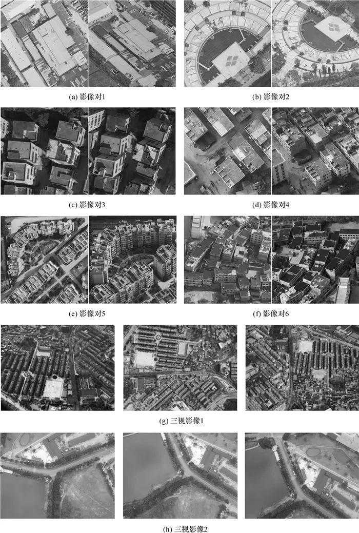 为了验证本文算法的有效性,分别采用6对典型的局部影像块、一组原始大小的三视航空倾斜影像和一组原始大小的三视无人机影像进行特征点匹配试验。如图9所示:(a)和(b)所示分别为平房和广场区域倾斜像对,其中参考影像为下视影像,搜索影像为斜视影像;(c)所示为无人机影像对;(d)—(f)所示均为倾斜影像,其中(d)和(e)中参考影像为下视影像,搜索影像为斜视影像,(f)中参考影像和搜索影像均为斜视影像;(g)所示为三视航空倾斜影像;(h)所示为三视无人机影像。试验数据详细信息见表1。