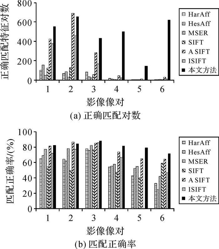 从图10(b)所示的匹配正确率可以看出,本文方法和ASIFT算法的匹配正确率优于其他方法。当影像初匹配能够获得一定数量的正确匹配用于估计影像几何变换模型时,ISIFT算法也能获得较高的匹配正确率,但是当影像视角变化导致无法通过初匹配来估计影像几何变换模型时,ISIFT算法将匹配失败。