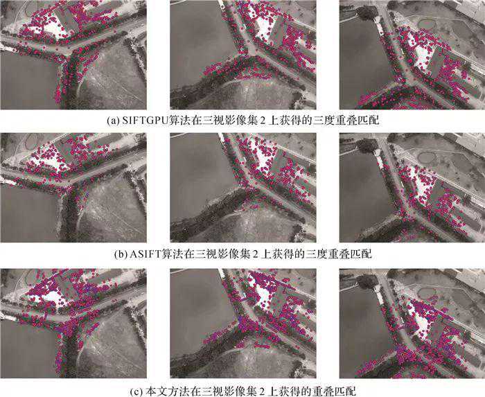 除了采用局部影像像对进行算法验证以外,本文试验还利用两组三视影像测试本文方法的匹配性能。鉴于SIFT算法的广泛应用以及ASIFT算法对影像视角变化的稳健性,这部分试验将本文方法与SIFT算法和ASIFT算法进行对比分析。在具体实施时,考虑到原始SIFT算法和ASIFT算法在处理较大尺寸影像时计算内存开销非常大,且算法时间效率极低,本文采用更加高效的GPU版本的SIFT算法(SIFTGPU[29])以及下采样模式的ASIFT算法(先将原始影像下采样为800×600像素大小的影像进行匹配,再将匹配结果反算回原始影像[30])。此部分试验以三度重叠匹配数量和匹配效率为评价指标。3种方法在两组三视影像上匹配的统计结果如下表2所示,三度重叠匹配如图11和图12所示。由于ASIFT方法的三度重叠匹配数量为0,因此图11中只列出SIFTGPU方法和本文方法的结果。