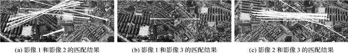 为了进一步验证ASIFT算法在三视影像1上的匹配效果,使用普通模式(直接在原始影像上进行匹配)的ASIFT方法对三视影像1进行匹配试验。具体实施时,采用OpenCV中的ASIFT算子,分别在三视影像1中的3幅影像上提取了2523709、3746247和3402273个特征点。数百万个特征点进行盲匹配和穷举搜索带来了巨大的时间开销(约67个小时),然而三度重叠匹配数量仍然是0。3幅影像两两匹配的结果如图14所示。从图14(b)可以看出,对于视角变化非常大的影像1和影像3,ASIFT算法获得的匹配点非常少,与图13(b)的结果一致。此外,从图14(a)和图14(c)所示匹配结果可以看出,虽然ASIFT方法在两两影像之间能够获得一些匹配点,但是匹配点在多视影像上的重复率非常低。