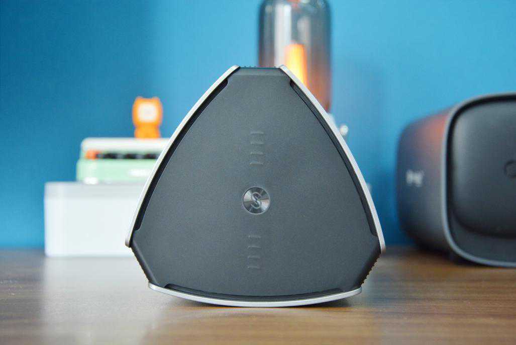 重点看看主产品锐捷星耀M32MESH路由器,它的外观首先就很特别,是一个“三角形”的柱体,乍一看似乎有点像个小音响,尺寸规格为119*128*201mm,没有外露的天线,放在家里的电视旁边、书桌上都不占太大空间,同时也为家装设计增色不少,显得很科技时尚。