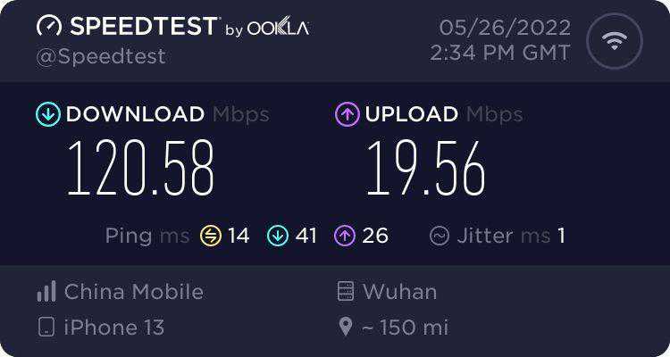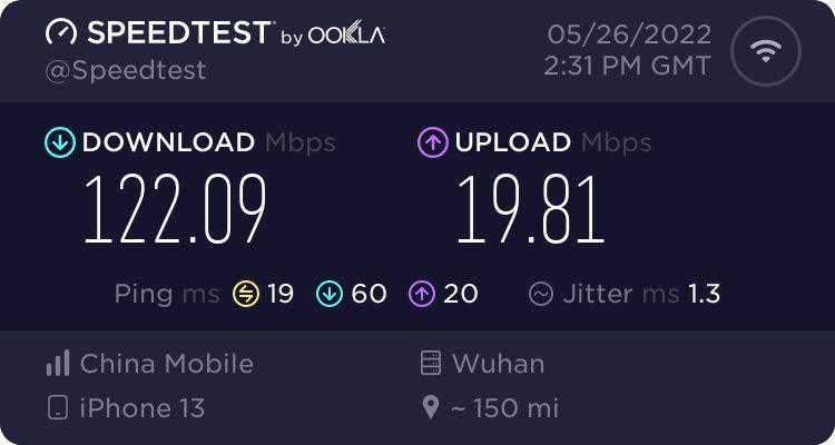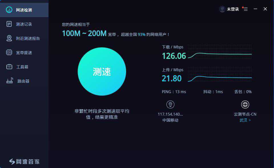 接着又对家庭的100M移动宽带进行了网速检测,它显示实时下载速率为126.06Mbps,上传速率为21.8Mbps,平均相当于100M-200M的宽带,这和办理的移动宽带是完全符合的。