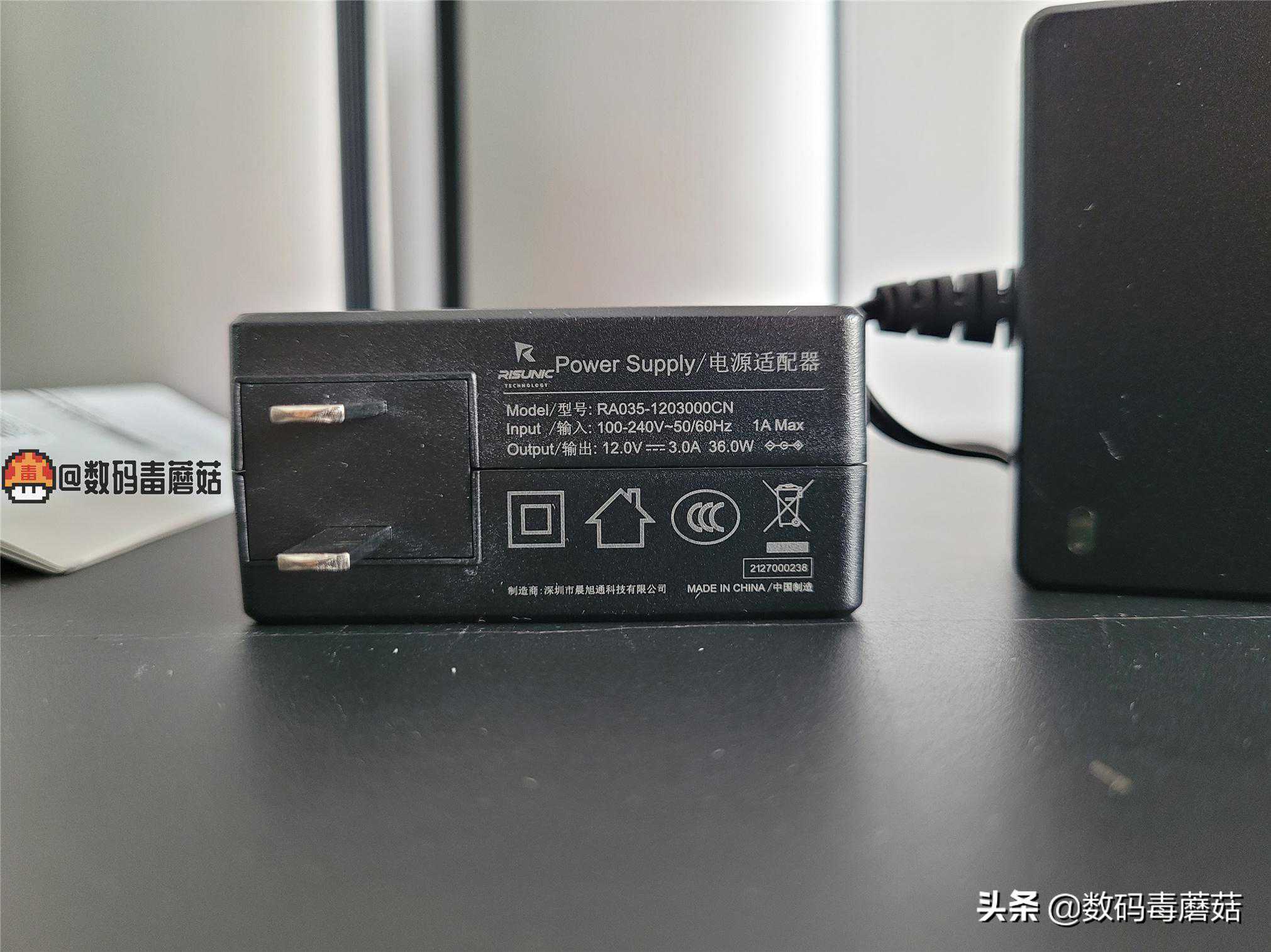 适配器规格非常足。是12v3a的,最大可以提供36w功率,我觉得把它换到软路由上也能用……适配器上面还带一颗绿色LED灯,我喜欢。