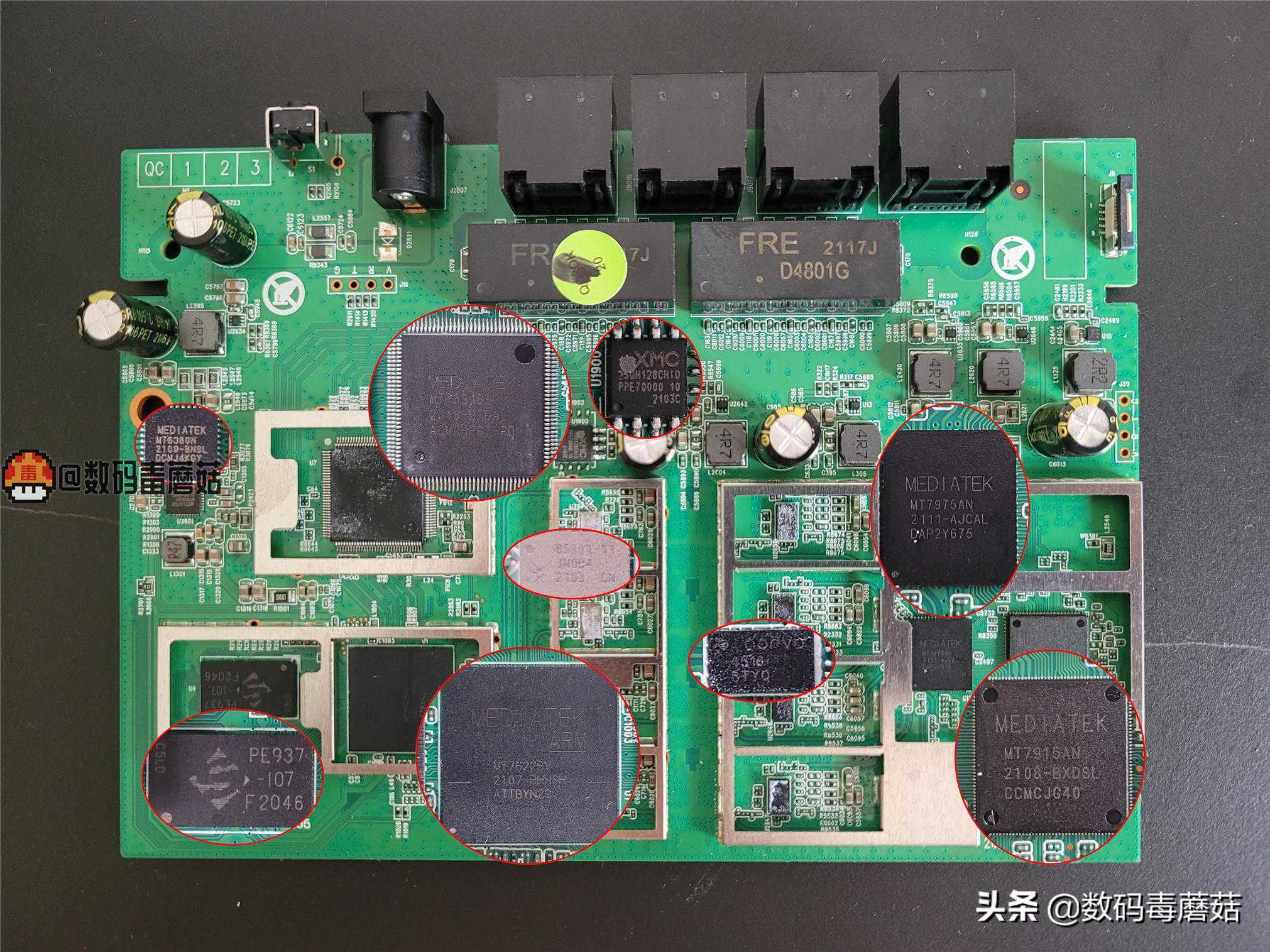 主板上面的所有硬件我给做了个放大,CPU为联发科MT7622BV,是一款ARMA53架构的双核处理器,主频高达1.35G;千兆交换机芯片MT7531BE;电源管理芯片MT6389N。