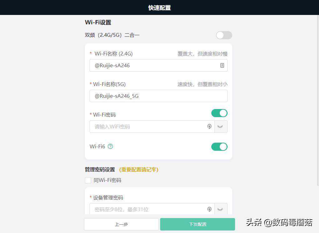 默认没有开启双频合一,然后我忽然发现锐捷这款路由器可以手动选择开启或者关闭WiFi6。我还是第一次遇到可以手动关闭WiFi6的路由器。