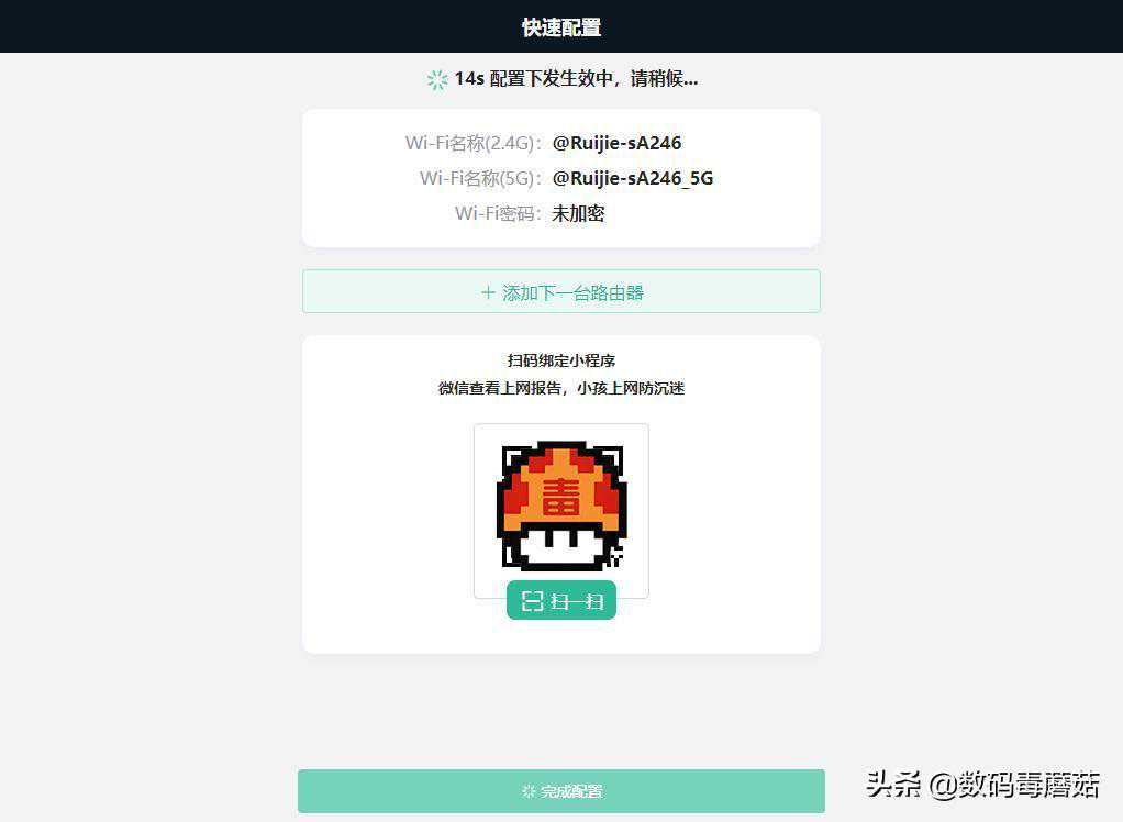 值得夸奖的一个地方是,别家的路由器如果要管理必须下载APP,锐捷路由器可以直接用微信绑定小程序,方便程度大大提高。