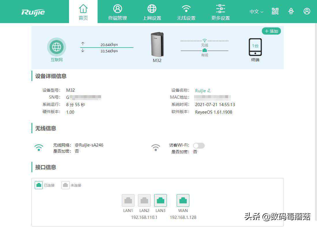 锐捷的设置界面是绿色的,IP地址是192.168.110.1,接上路由器后PC端会自动弹出浏览器设置界面,好评。