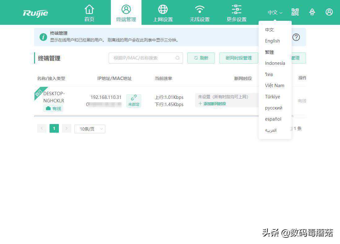 终端管理界面可以设置断网时段,从而达到控制设备上网时间的目的,也可以对联网设备进行拉黑处理。对了,可以设置中英繁体、印尼语和……那啥那啥以及那个啥等六种语言。对语言比较熟悉的朋友帮忙看看,是不是没有日韩?
