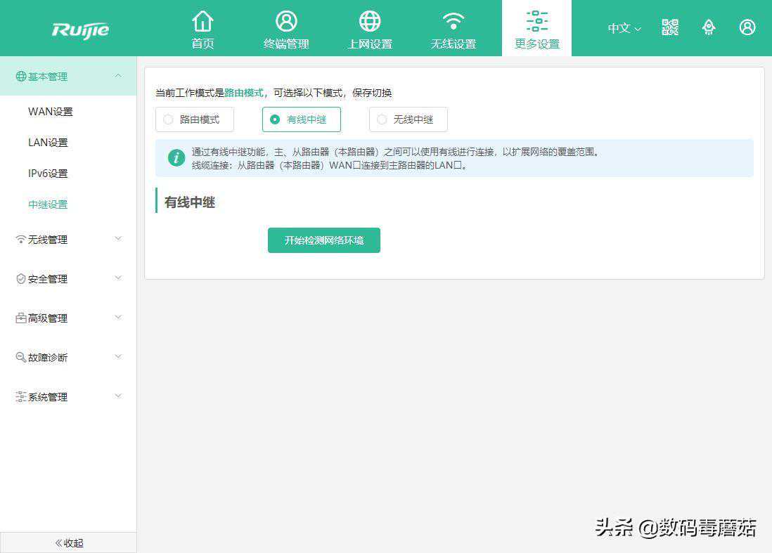 当下固件支持iPv6。但是这个中继模式和别家有点差别。路由模式和无线中继我都懂,目测这个有线中继功能就相当于是无线AP吧?