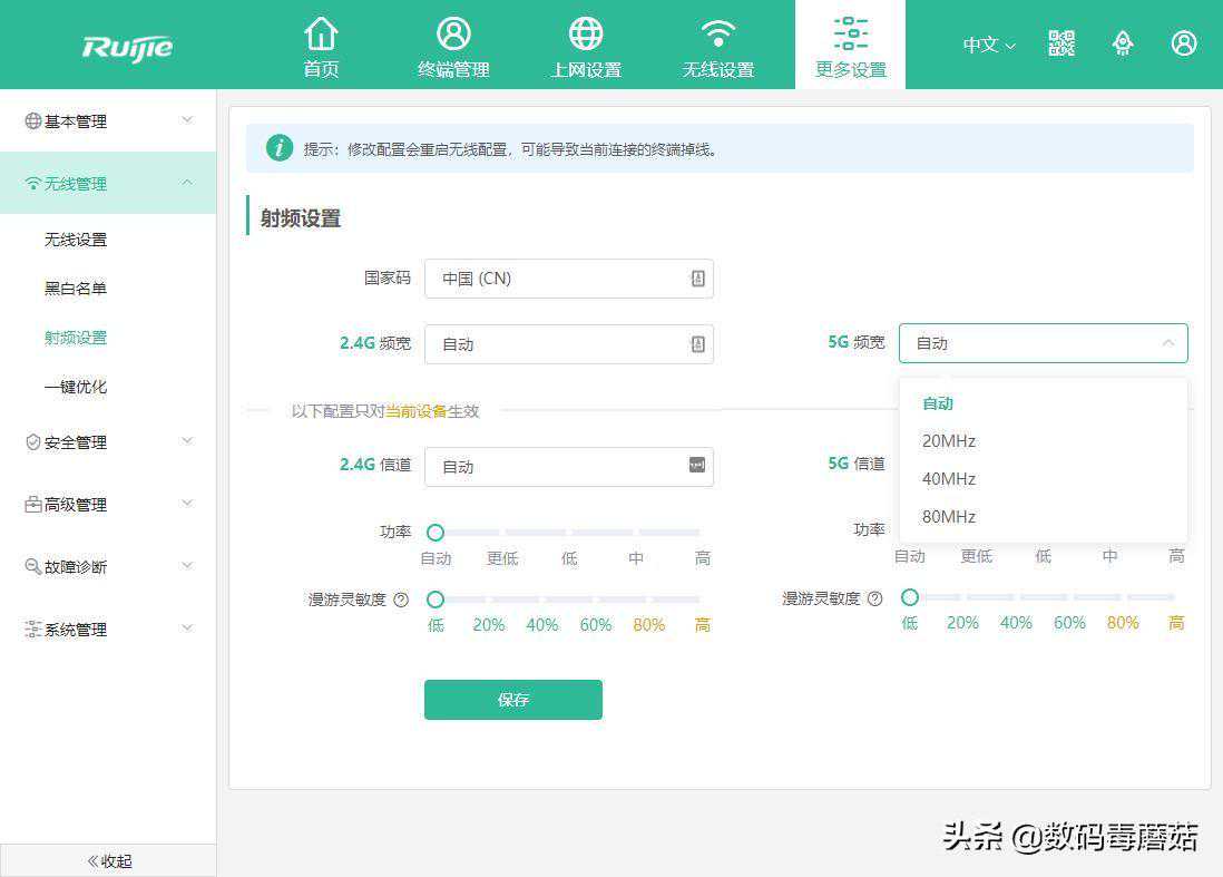 无线设置这里可以调整的选项比较丰富,除了常规的频宽和功率可以调整以外(5G不支持160MHz),也支持漫游灵敏度调整。