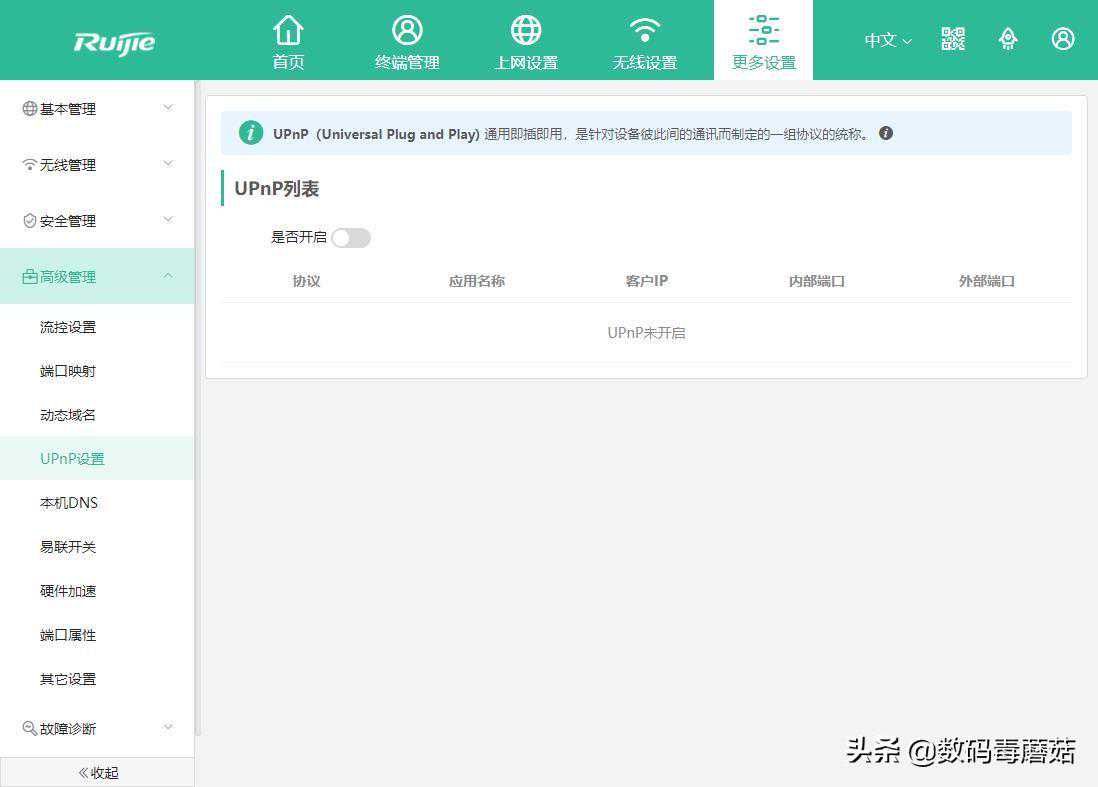 默认状态下是没有打开UPnP的,如果挂有X云和X糖等设备,请自行打开。