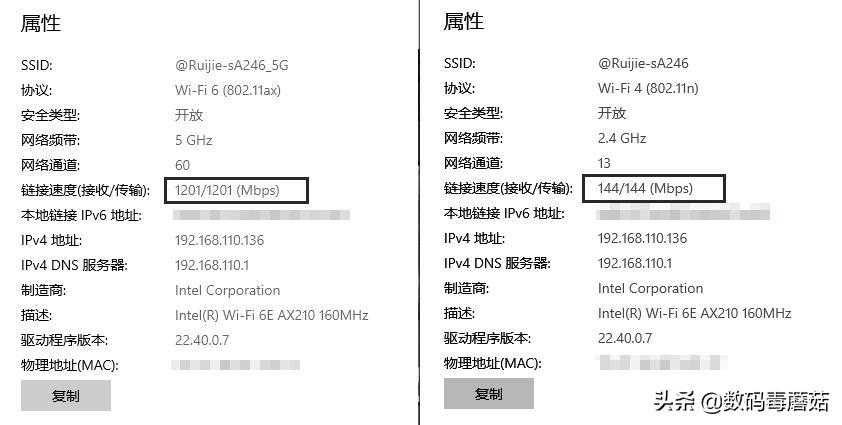 电脑网卡AX210连接锐捷M32后5G/2.4G网速。