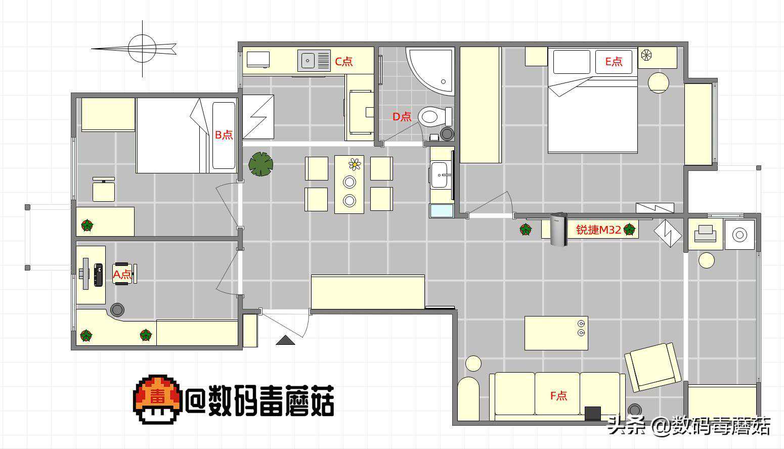 测试户型图如上。110平米小三居,路由器放在客厅电视柜上,单台非MESH模式,只连接5G进行网速测试。分别选择ABCDEF六个测速点来模拟真实使用情况,其中B点为极限距离+极限穿透。厂家都会建议把路由器放在家里居中的位置,按照我这种摆放模式,绝对比150㎡房间把路由器放在中间要极限。