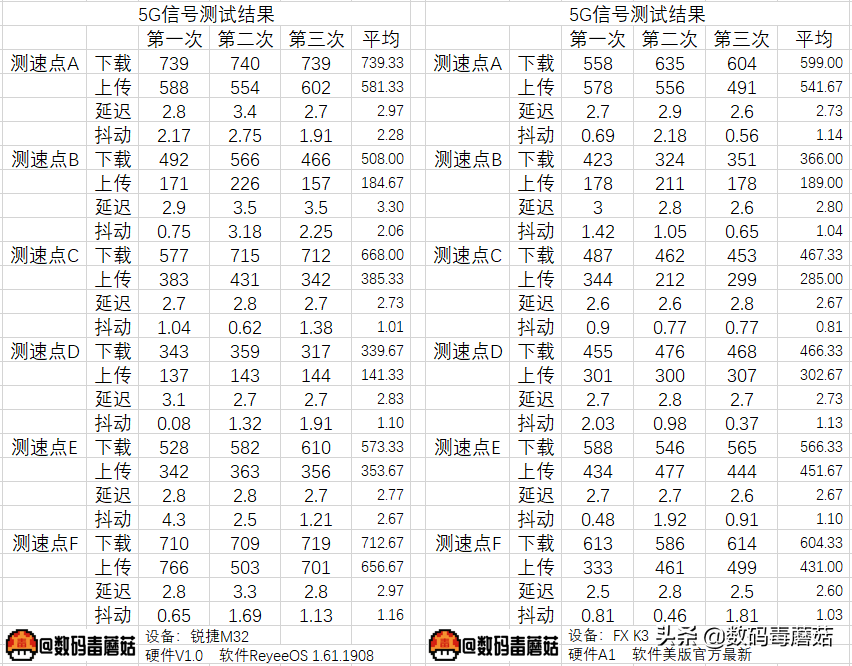 在每个测试点都测试三遍以保证数据准确性。对比设备为之前WiFi5的所谓天花板机型FXK3,可以看得出,除了在测速点D网速差一些以外,其余测速点均要高过K3(上传、延迟和抖动请忽略,测K3的时候比较早,是双条内存;测M32的时候是单条内存)。