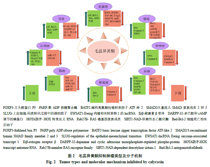 毛蕊异黄酮对乳腺癌、直肠癌、宫颈癌、甲状腺癌以及肝癌等多种恶性肿瘤均有较强的抑制作用,如图2所示。本文对毛蕊异黄酮针对的肿瘤及相关通路进行了整理,结果发现毛蕊异黄酮发挥抗肿瘤作用通路涉及细胞凋亡、细胞周期、自噬、免疫以及炎症等多个方面。