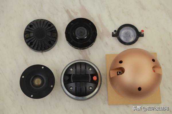 上排是一般的压缩驱动器拆解零件,右方是振膜,左方是磁铁总成,振膜推出来的声波会从中间的那个机构同心圆状的孔隙挤出来,这就是压缩驱动器的原理。下方左侧为一般的软半球高音正面,它的声波扩散就靠单元周围的浅号角导波,效果有限。