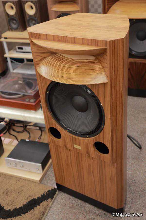 在压缩驱动器前方再加上号角开口,这个号角开口的形状、尺寸、和角度,会影响声音的扩散。以雷尔斯音箱的设计,除了他们后来开发出来的lifestyle走向的圆号角音箱外,所有经典款式都采用120度角开口的传统号角。号角均采俄罗斯白桦木夹板制成,黏合成块后加以CNC切割成形。这个号角的尺寸和厚度会影响低频的截止点,越大的号角,低频截止点可以拉得更低。我们可以把压缩驱动器比做高压水管,号角看成是莲蓬头,透过高压水管,水力十足,透过莲蓬头,则让设计者可以根据自己的需求设计花洒的类型。而这个压缩驱动器和号角都是黄日兴设计的,专供各款雷尔斯音箱使用,外面买不到。