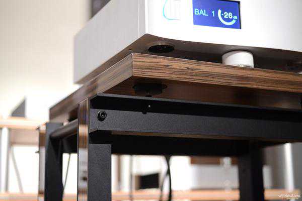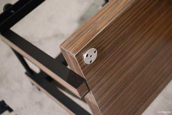 底部角锥也是能调整高低的,请务必使用水平仪从底部就开始校正水平,这个角度也可以看到承板的厚度极厚。这个承板外表看起来没有什么特别,但是其使用了多达45样的高质量组件与8种不同阻尼条件与特性的材料,以CNC与手工制做而成。
