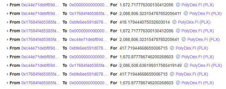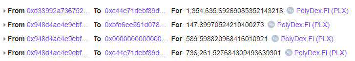 攻击者首先使用PolyDex的WMATIC和WETH池进行PLX借贷,如下图所示: