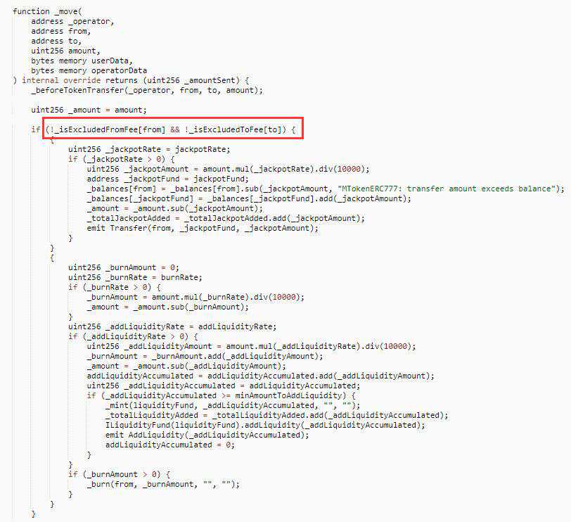 PLX代币合约进行代币转移时,如果from地址不在_isExcludedFromFee列表中,并且to地址也不在_isExcludedToFee列表中,会对转移的代币收取一次奖励基金以及销毁本次转移代币数量的0.05%。