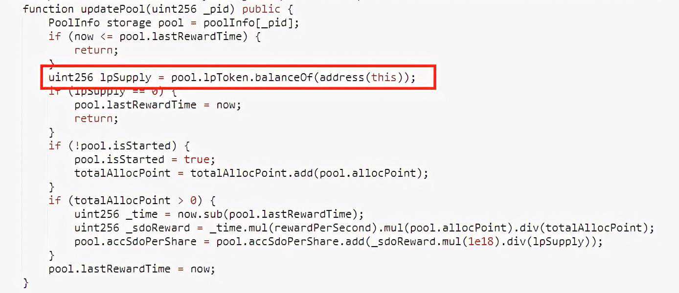 攻击者事先通过攻击合约(0x358483BAB9A813e3aB840ed8e0a167E20f54E9FB)在该抵押池中抵押214.235502909238707603PLX,在攻击合约(0xC44e71deBf89D414a262edadc44797eBA093c6B0)攻击完成后,控制攻击合约(0x358483BAB9A813e3aB840ed8e0a167E20f54E9FB)在该抵押池中进行奖励领取,由于SdoRewardPool合约中更新抵押池信息时使用的是balanceOf函数获取本合约中抵押代币数量,故获取到的数量是恶意减少之后的数量,继而造成PLX抵押池中accSdoPerShare变量异常增大,从而获取到巨额的SDO代币奖励。