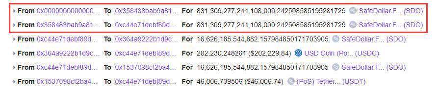 有消息指出,一份未经证实的合约抽走了25万美元的USDC和USDT;后经分析证实,此次攻击事件中黑客总共获利价值25万美元的USDC和USDT。随后,SafeDollar项目方发布公告,要求投资者停止所有与SDO相关的交易。目前,SDO交易已暂时中止。