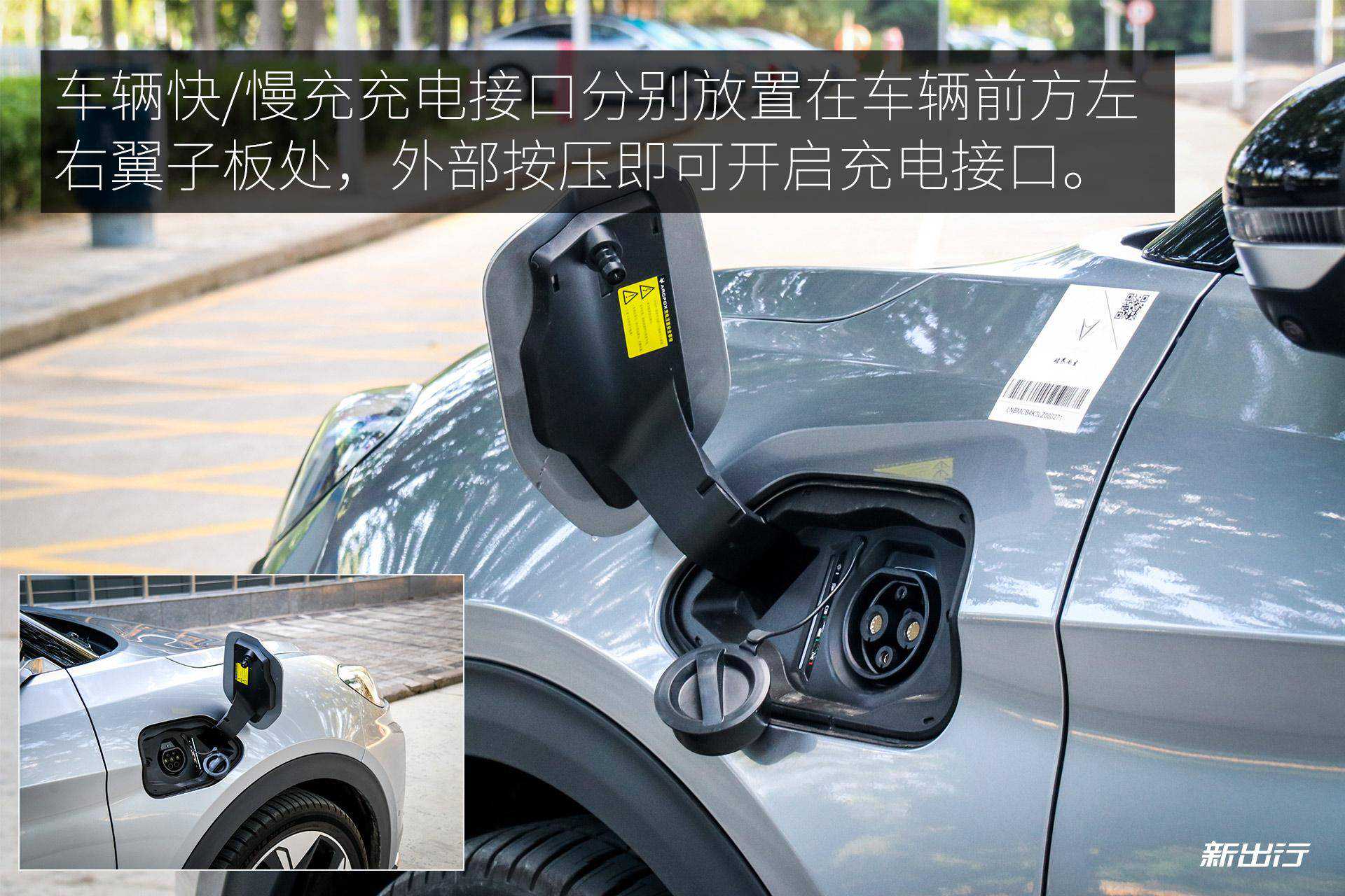 主驾驶位置前方翼子板配有的是直流快充接口,按压即可打开充电接口,官方表示在使用直流快充从0-80%需要35分钟;交流慢充接口被放置在副驾位置的翼子板处,官方表示使用交流慢充从0-100%需要花费7.5小时。