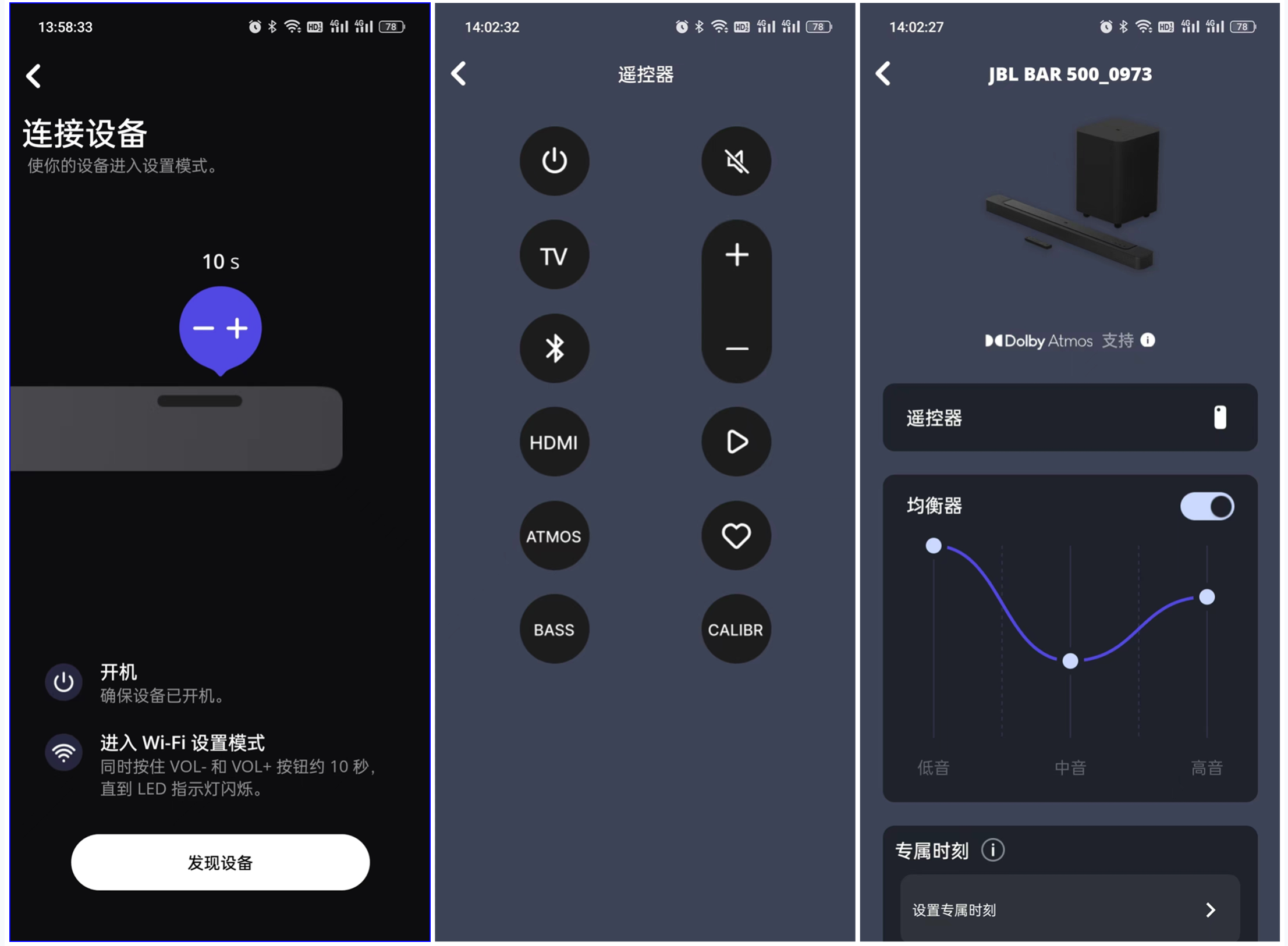 JBLBAR500的安装是做到了“傻瓜式”的,无线连接不需要各种乱七八糟的桥接、排线,直接接入电源自己就完成了部署连接,使用门槛算是相当低了。用HDMI连接上电视,基本就大功告成了。为了方便使用,还配备了专属APP“JBLONE”,可以调配专属音效,也可以兼职遥控器。当然,音箱是配备了实体遥控器的,操作简单这里就不过多赘述。