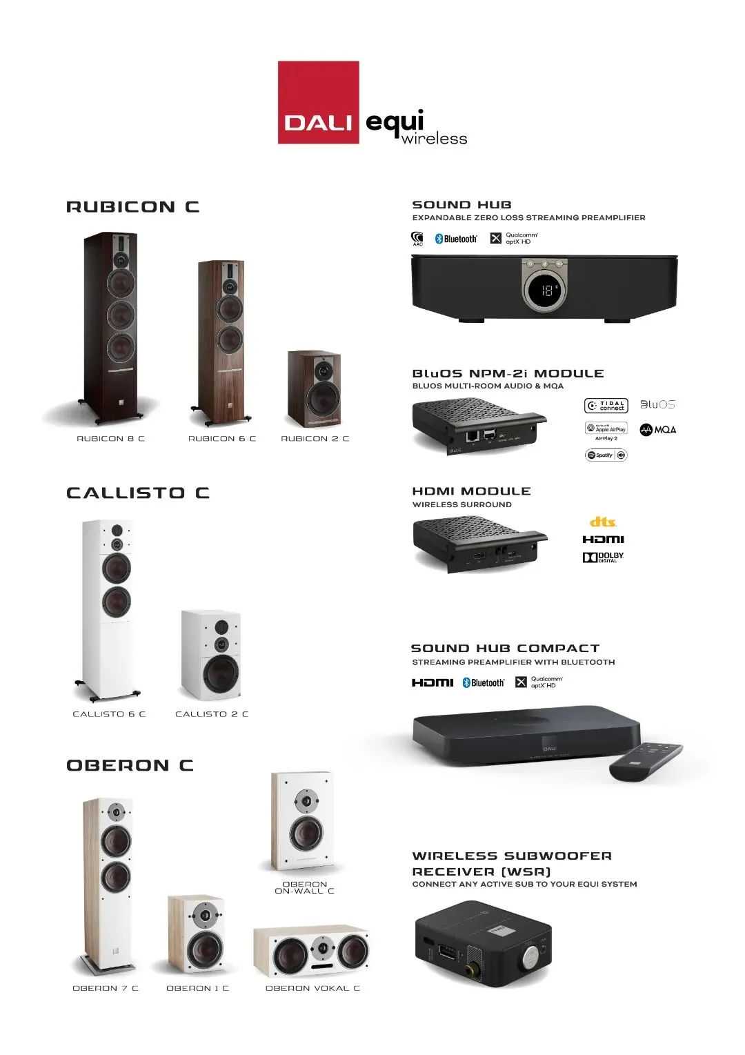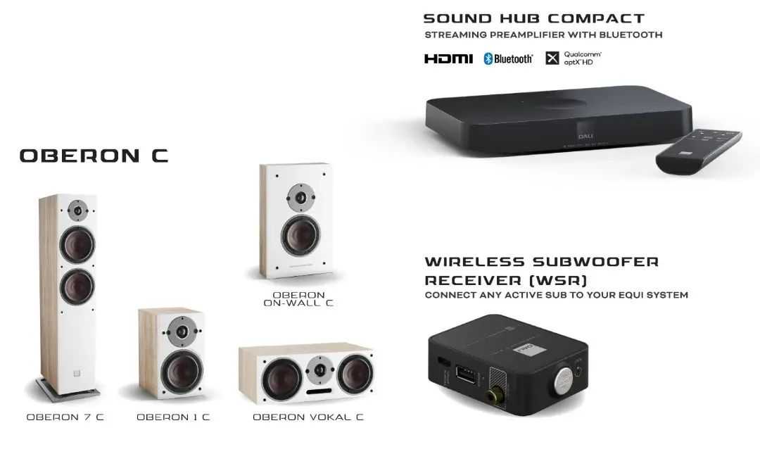 达尼一直致力于设计生产出便捷、高质量的无线有源音箱。集DALI所长组建的全新无线系统EQUIwireless(无线家庭影院系统)指的是,在DALISoundHub/HubCompact无线发射器的基础上与RUBICONC或OBERONC或CALLISTOC音箱创建一个最多高达7.1通道的无线家庭影院系统。