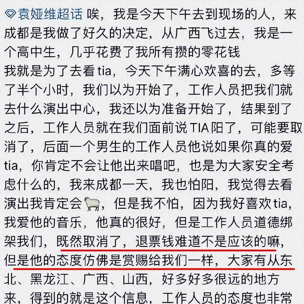 更加令人匪夷所思的是,演唱会当天早上,她的嗓子就已经失声了,但中午时她还在装作一切正常,号召粉丝从全国各地赶到成都观看演唱会,最终却让大家扑了个空。