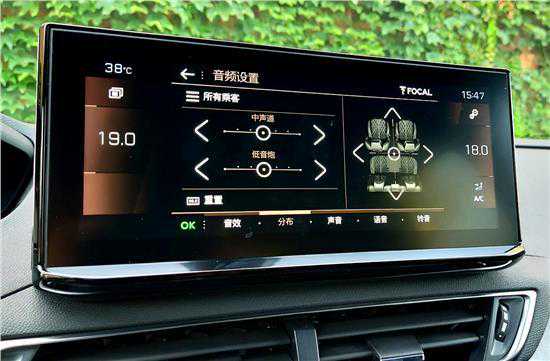 在Focal劲浪的参与下,标致全新4008在音效上,可以调节低音、中音、高音的增益幅度,各有14个挡位。在分布上,可以调节中声道和低音炮的增益。比如,打算播放听人声、女声为主的歌曲时,可以调节中音道,这样人声会更加突出。遇到动次打次的低音歌曲时,还能调节低音炮助兴。