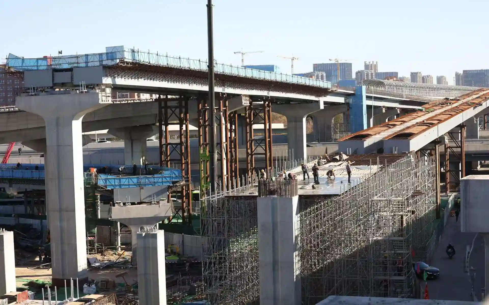 今天上午,记者在北清路快速化改造工程的施工现场看到,北清路与京藏高速的互通立交桥区已经初具规模,多座高架桥在空中纵贯横穿,织成一片复杂而又联系紧密的空中路网。