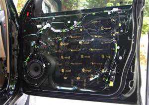 在车门内面贴上一层中道震板!经过这样的施工,不只能增强车门的刚性和减少共鸣声,而且能有效降低汽车高速行驶的风噪声。第二层是在外层贴上一层中道震板,让车门形成一个密封的箱体,音响效果明显提升,关门声音厚实,阻隔风燥通过车门传入!