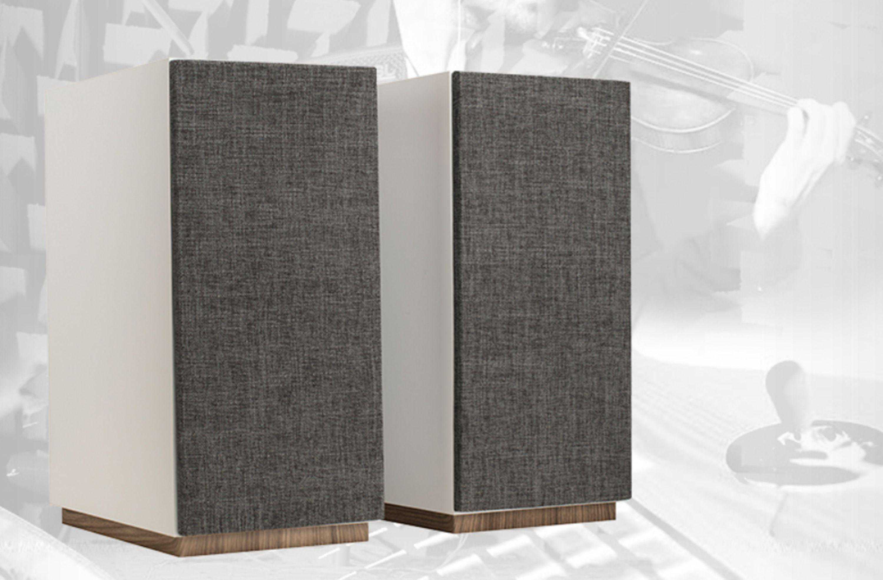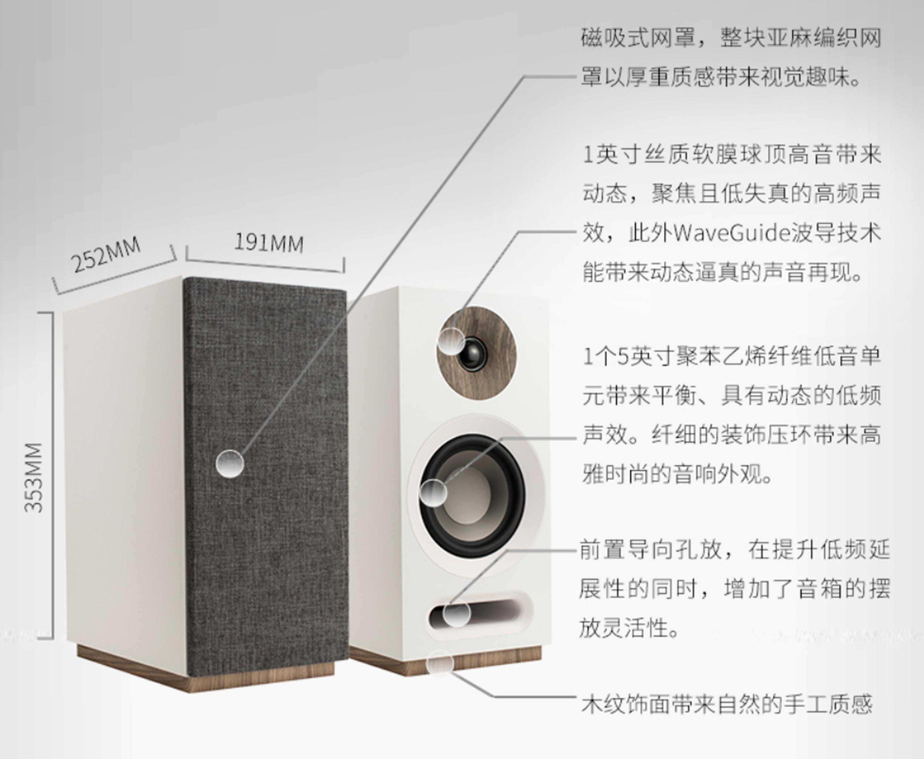 ▲布艺网罩有点类似尊宝S803的风格,都是丹麦的“幸福感、设计感”风格。扬声单元包括1英寸丝膜软球顶高音单元和5英寸MSP音盆低音单元,而且采用仰角和扇形排列的喇叭单元,可以获得更宽阔的声场。