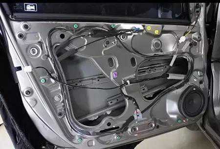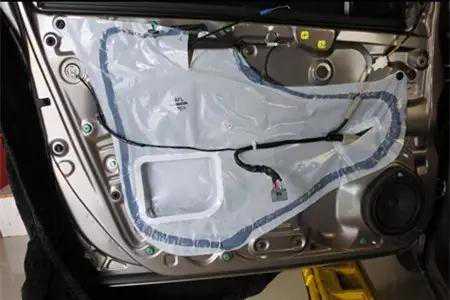 拆下门板可以看到原车门板只有一层薄薄的防水膜,根本起不到隔音和密封的作用