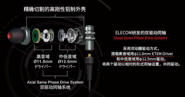 官方的产品结构分解图,可以看到扬声用了两块不同的振膜,按官方资料来说是13层的MLF超多层生物振膜,也称为帝龙特多龙薄膜MLF。在日本厂商中,还有松下在开发类似的动圈,不过松下的构造与这个不太一样,松下的是“双轴动圈”只使用一块振膜,但是装两块磁铁和CCAW线圈。从结构上来说宜丽客这个双振膜的结构更有“双单元耳机”的意味。
