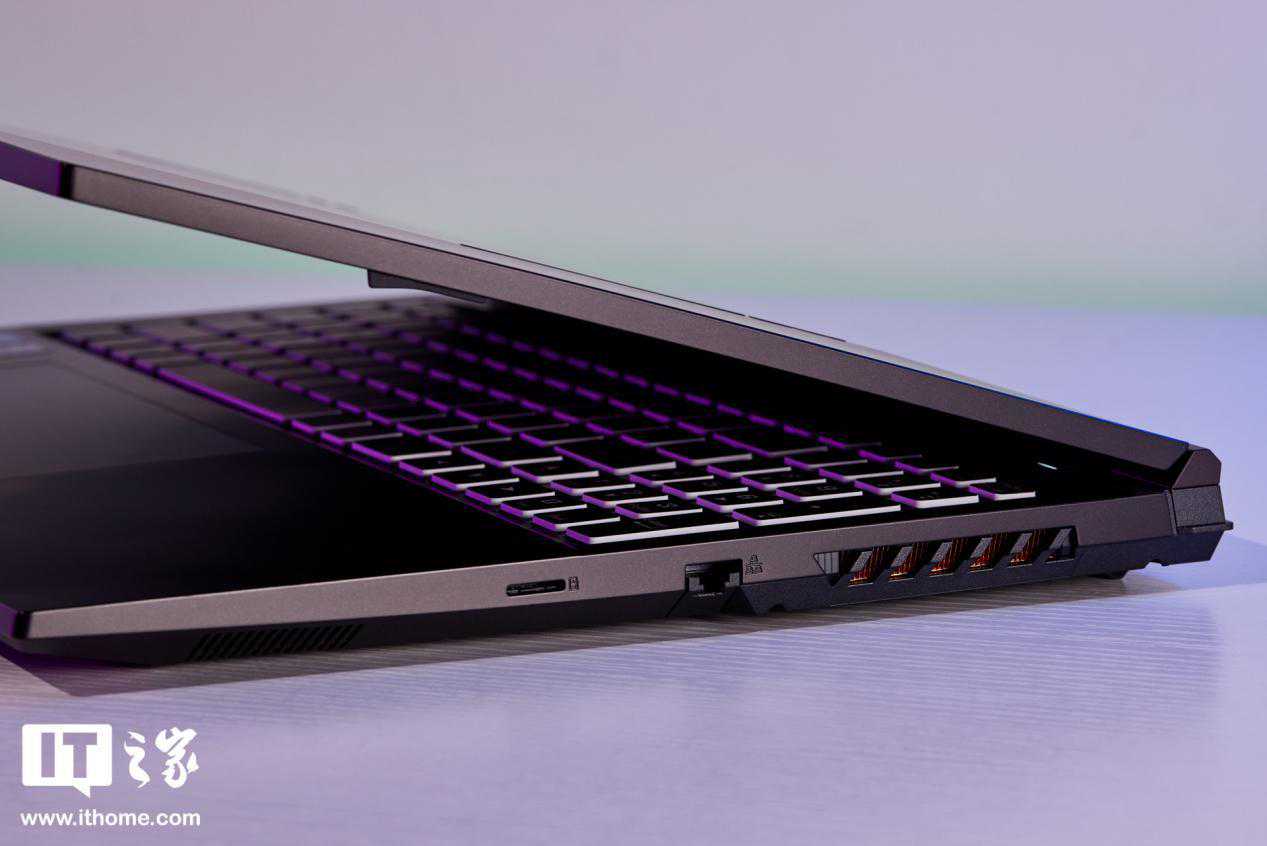 A面是塑料材质,两侧有红色的透明灯条,在屏幕点亮时这两个灯条也会一起点亮,为整机的电竞感增色不少。