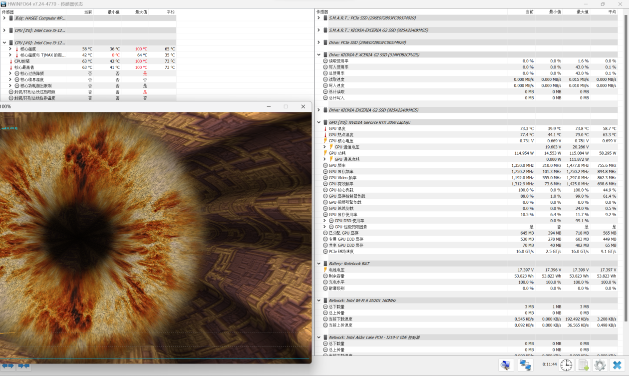 然后我们使用FurMark甜甜圈进行单烤GPU,15分钟后,温度稳定在73℃,功耗稳定在了115W的基础功耗,这个性能释放还是很保守的,显卡的温度并不高。猜测是因为电源适配器不够大,为了照顾i5-12500H所以没有上满血显卡。